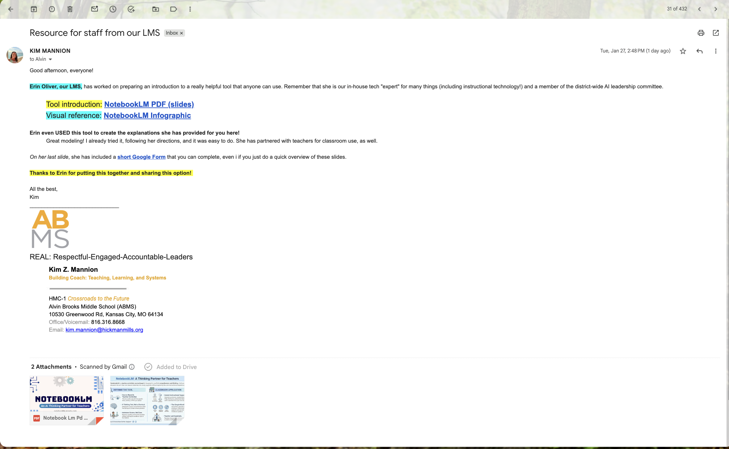 An instructional coach highlighted my work on the district AI leadership team after I created and shared a NotebookLM resource for staff. This work focused on helping teachers understand how AI tools can support responsible use, classroom integration, and professional learning.