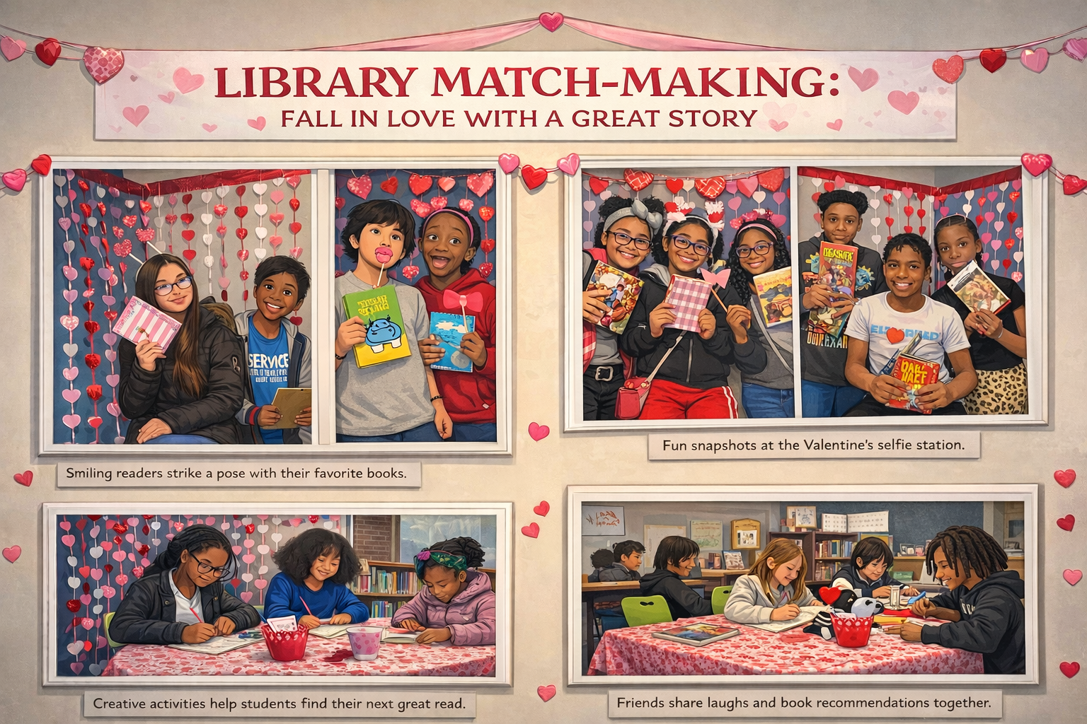Students explore curated book selections through themed prompts, “blind date” style choices, and conversation with peers. A selfie station and simple visual touches add a sense of celebration and remind students that reading can be shared and enjoyable, not just academic.