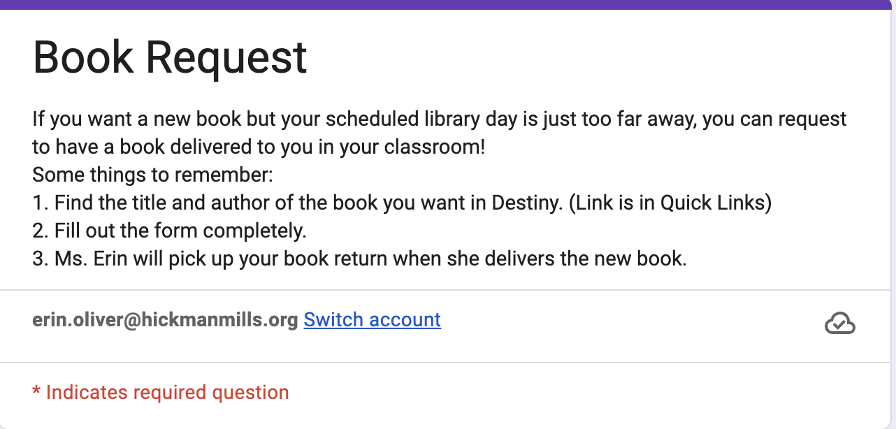 To remove that barrier, I created a simple book request system inside Google Classroom, where every student is already enrolled. Students can search the Destiny catalog, place a request, or ask for reading suggestions if they are unsure what to choose. A short screencast helps students who need a refresher on how to navigate the catalog.